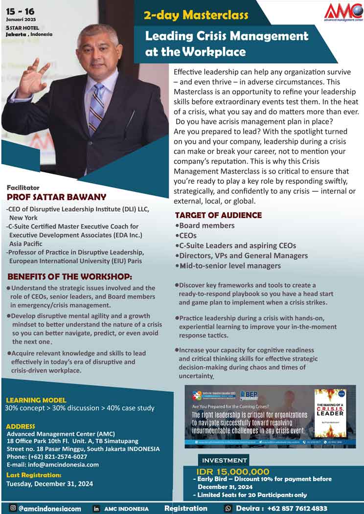 This is why this Crisis Management Masterclass is so critical to ensure that you’re ready to play a key role by responding swiftly, strategically, and confidently to any crisis — internal or external, local, or global.