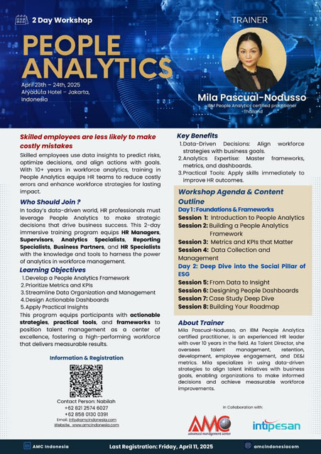 In today’s data-driven world, HR professionals must leverage People Analytics to make strategic decisions that drive business success. This 2-day immersive training program equips HR Managers, Supervisors, Analytics Specialists, Reporting Specialists, Business Partners, and HR Specialists with the knowledge and tools to harness the power of analytics in workforce management.