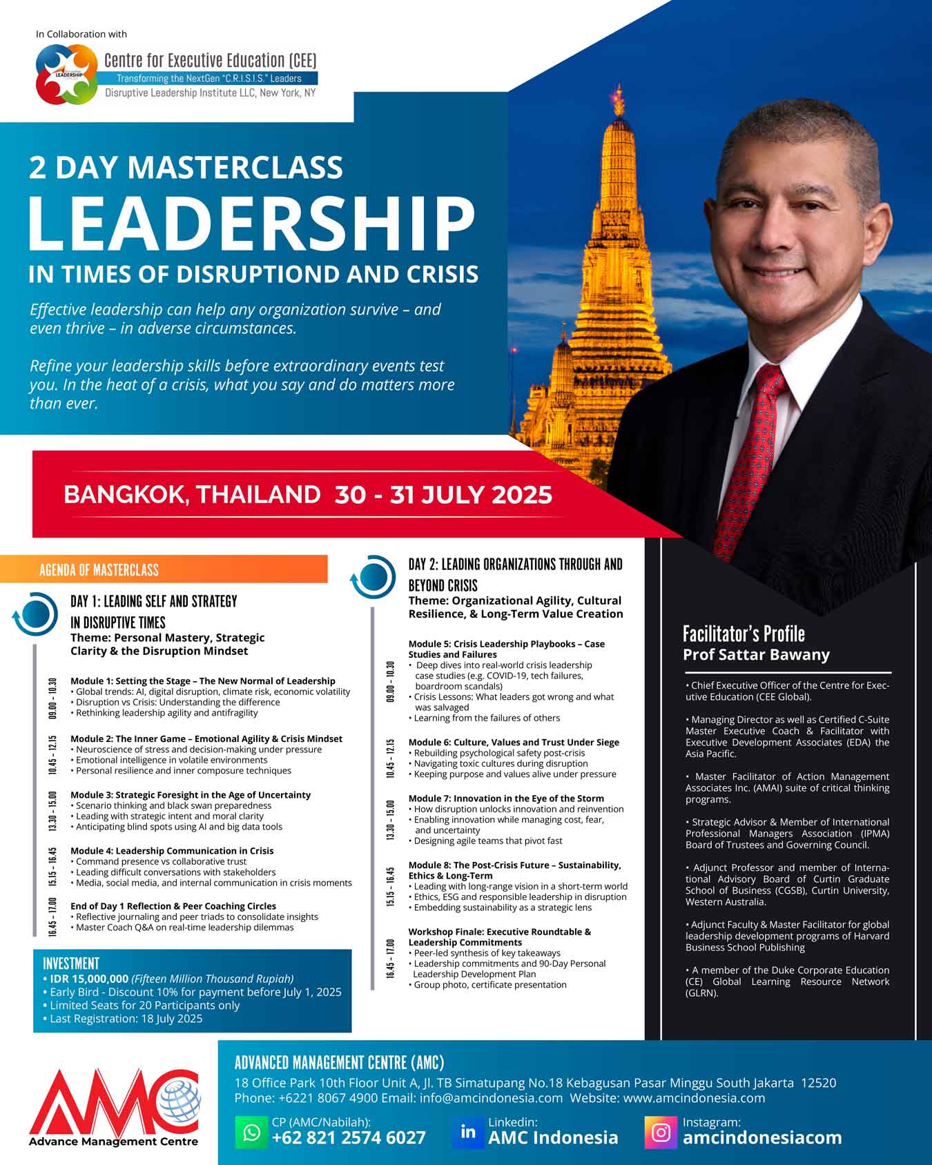 This 2-day immersive masterclass prepares senior leaders with modern crisis leadership strategies, decision-making tools for the AI era, and practical methods to build resilient organizations that can thrive in uncertainty.